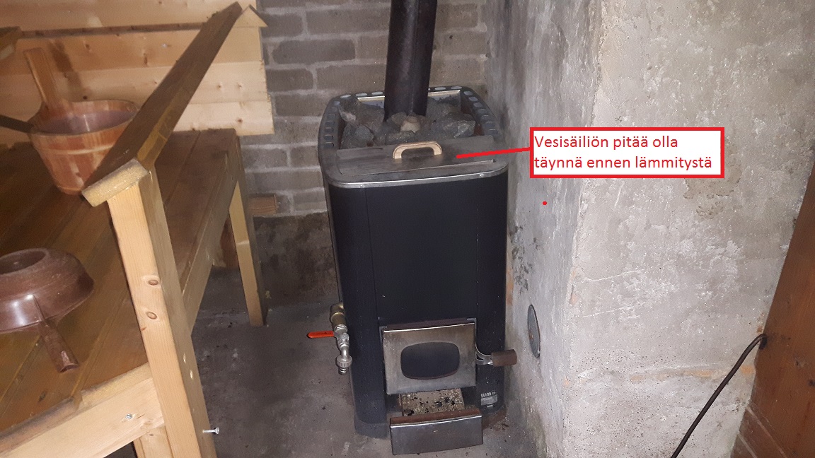 Saunassa on matalahko takaovi, josta päätään varoen voi kulkea vilvoittelemaan